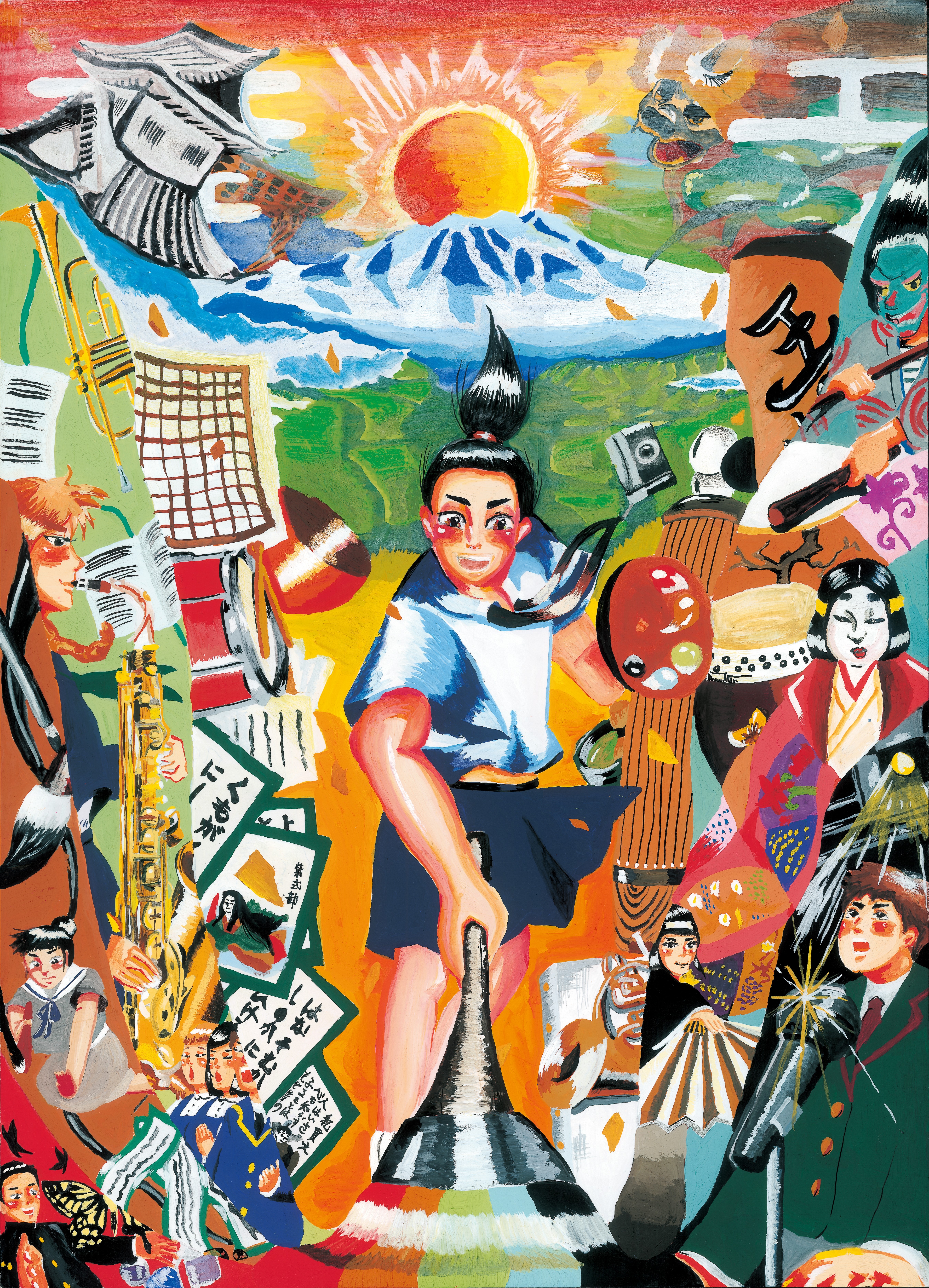 私は工芸科の生徒として石川県の伝統や伝統工芸がこれからも守り続けていけるようにという願いを込めてこの絵を描きました。大会のテーマに沿って、中央の少女が大会イメージカラーの筆で「未来」を彩っているような構図にしました。背景には輪島の白米千枚田や日本海、白山といった石川県自慢の美しい風景が広がっています。芸術やその他様々な文化と石川県の伝統が創造の羽を広げ羽ばたいていけるような「未来」につながる「2027いしかわ総文」にしていきたいと思います。