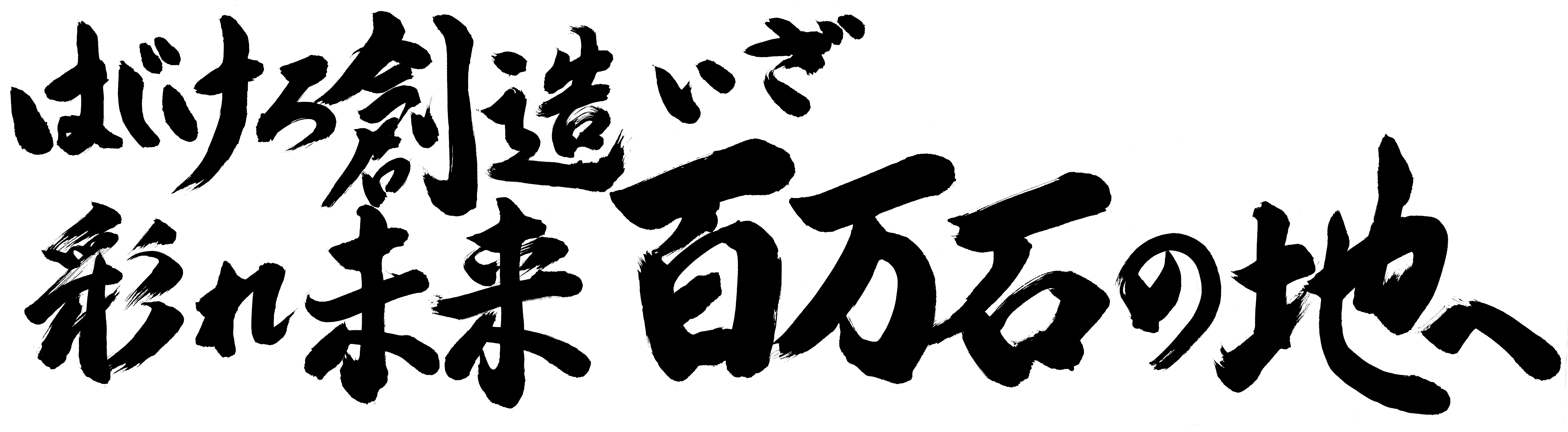 漢字の「創造」や「未来」という字に迫力をもたせました。石川の地である「百万石」という言葉が目につくように大きく書き、目立たせました。「いざ」には、言葉どおり、今からいざ行く!という力強い気持ちを込め、太く大きく表現しました。